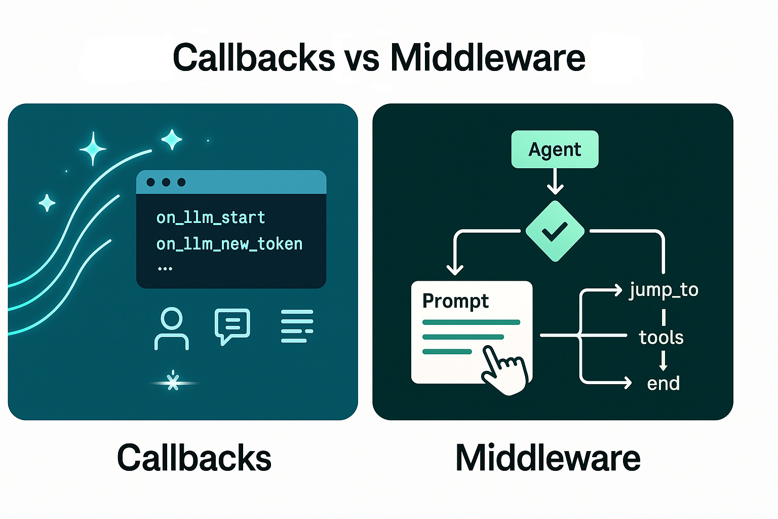 Use callbacks when you want to observe what’s happening (logging, tracing, streaming tokens). Use middleware when you want to shape behavior (modify requests/responses, enforce policy, or alter control flow like short‑circuiting or jumping back to the model/tools).